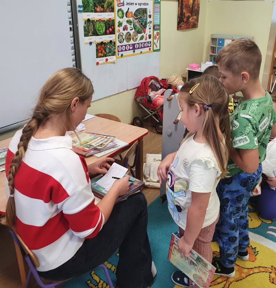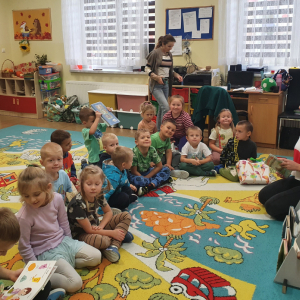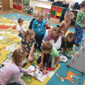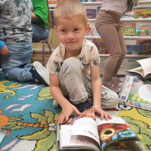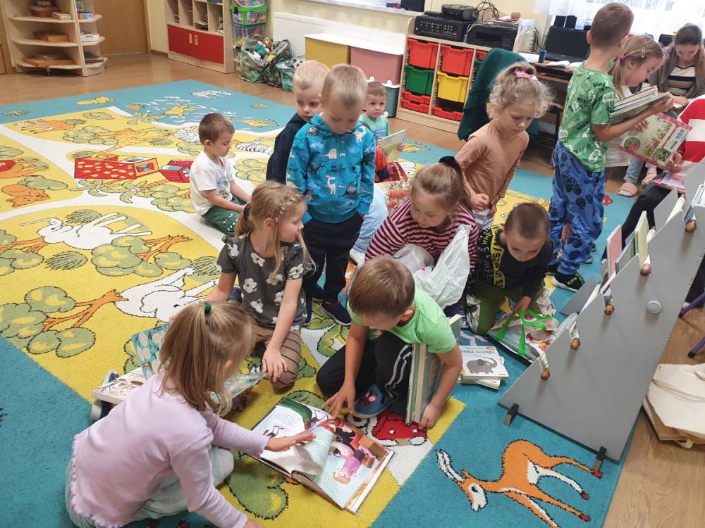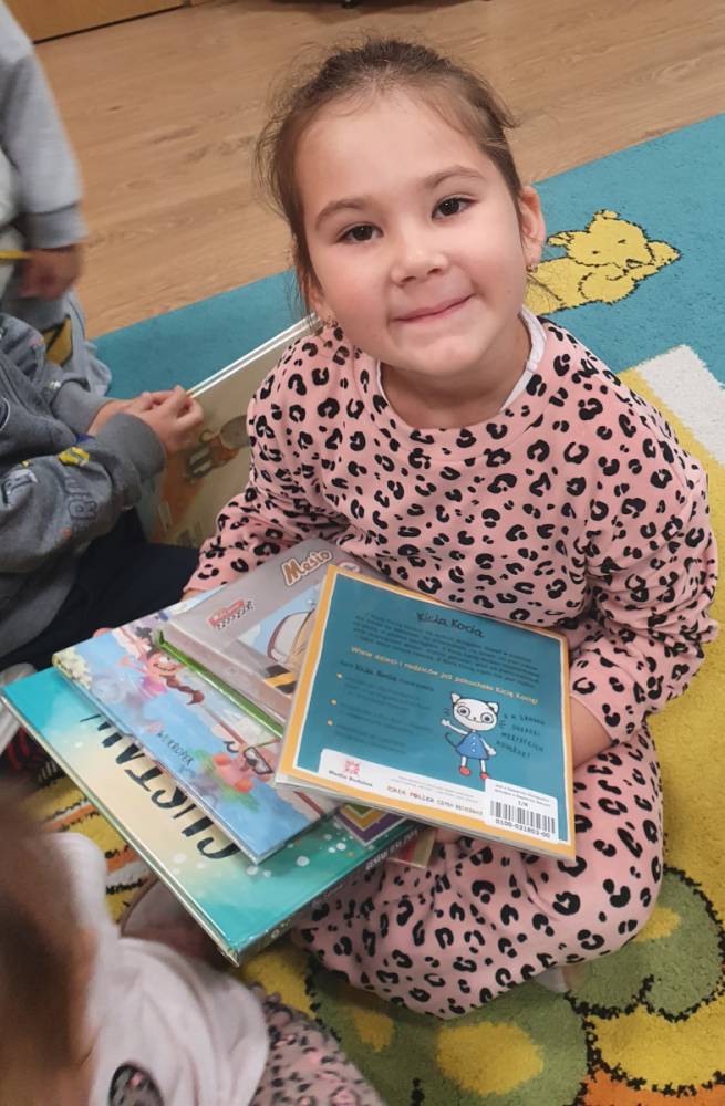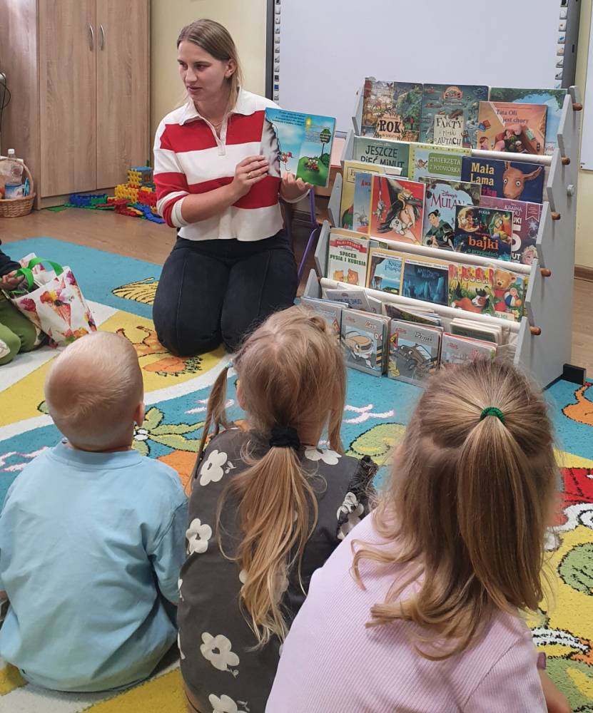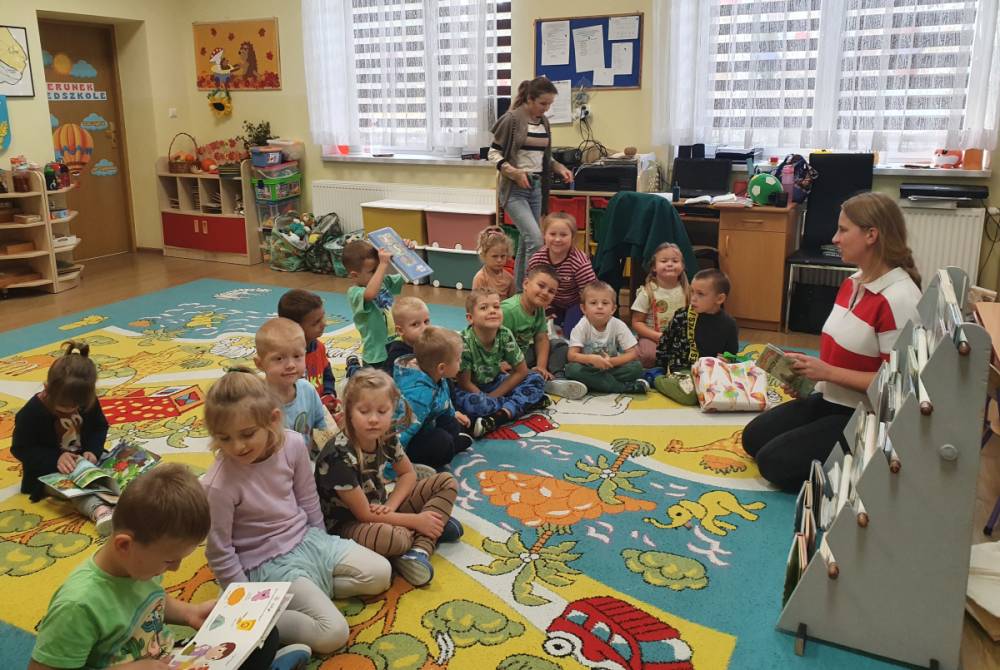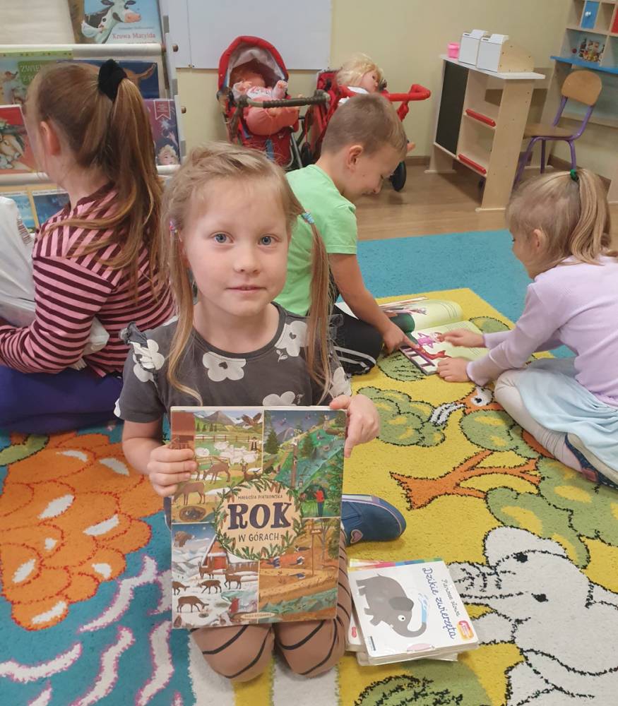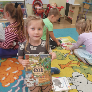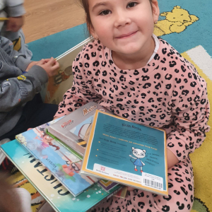 W ramach akcji „Mobiliteka dla małego człowieka” najmłodsi mają możliwość wypożyczania lub oddawania książek dzięki mobilnej bibliotece. Pani Alicja Witek, bibliotekarka z pobliskiej biblioteki, odwiedza nasze Sówki w każdy poniedziałek. Dzieci z niecierpliwością wyczekują spotkania z panią Alą, aby posłuchać ulubionych bajek, wypożyczyć nowe, ciekawe książeczki, a także porozmawiać o przeczytanych historiach i podzielić się swoimi czytelniczymi wrażeniami. Serdecznie dziękujemy pani Alicji za rozwijanie w dzieciach pasji do czytania i wspólne literackie przygody!