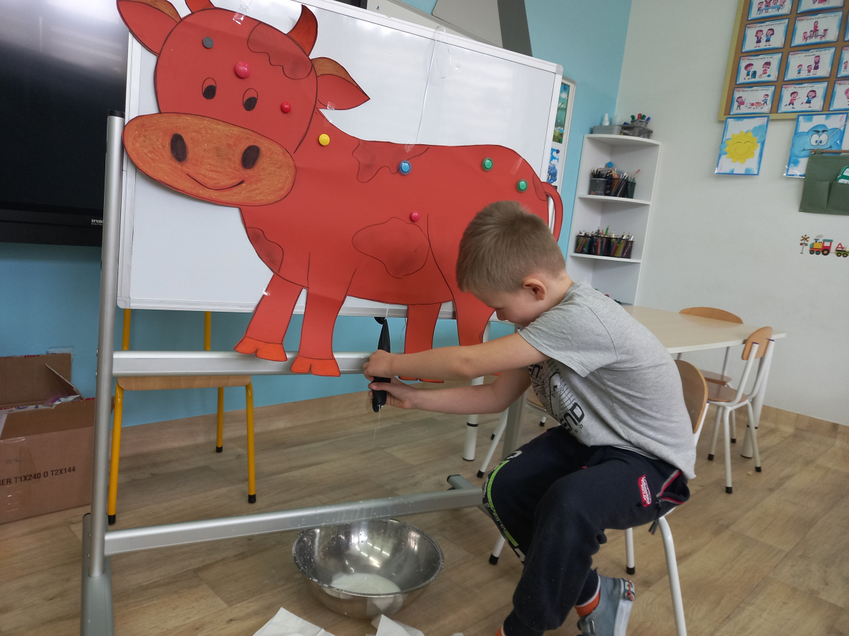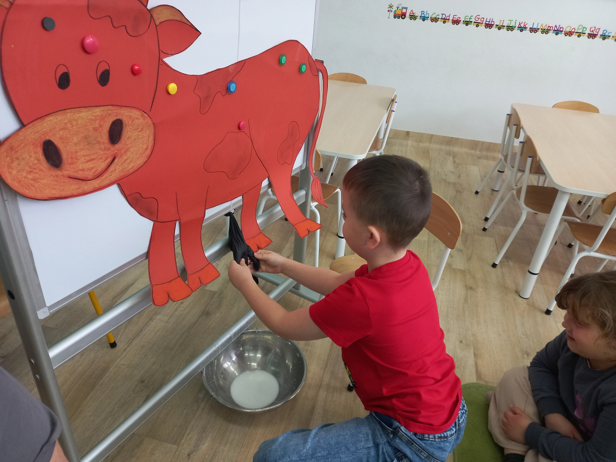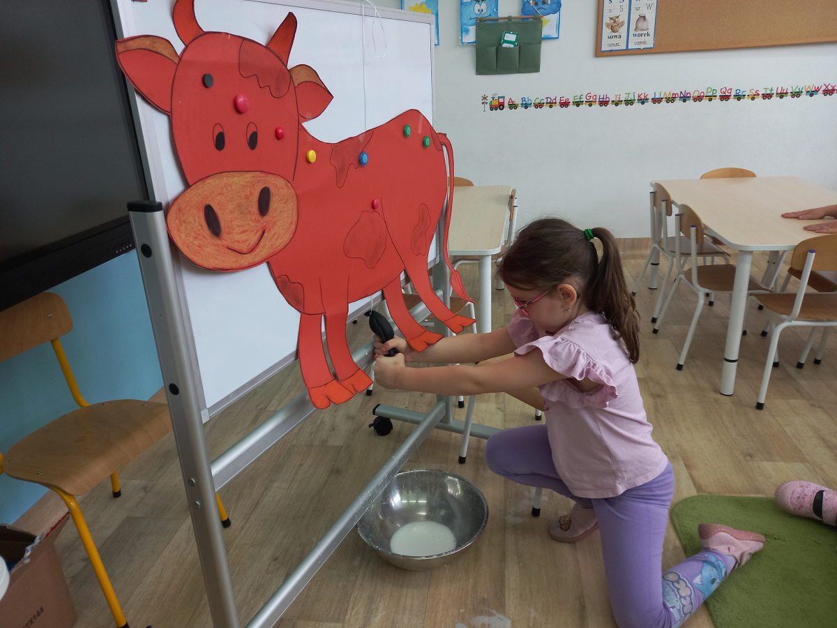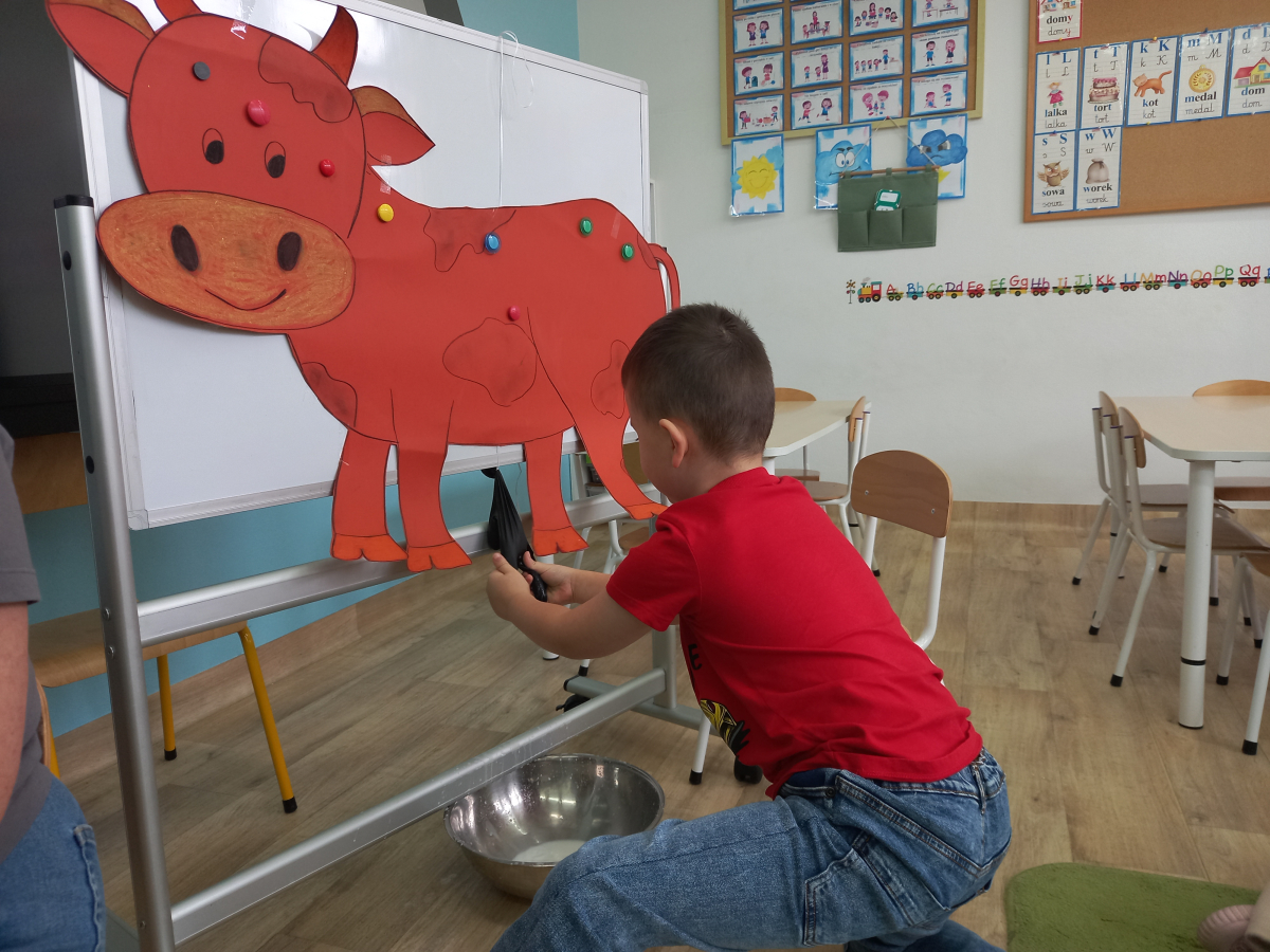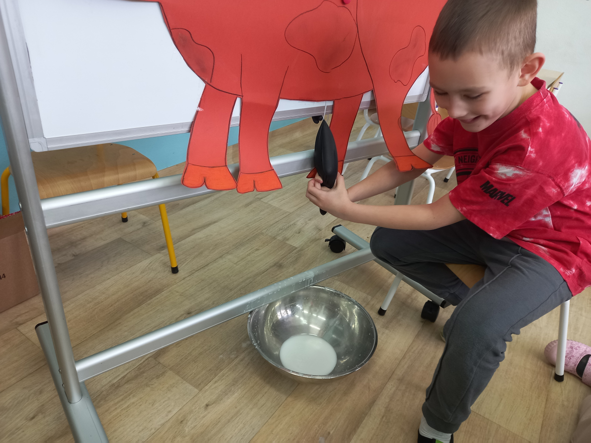 Dzieci podczas zajęć o gospodarstwie miały okazję spróbować dojenia krowy ;)