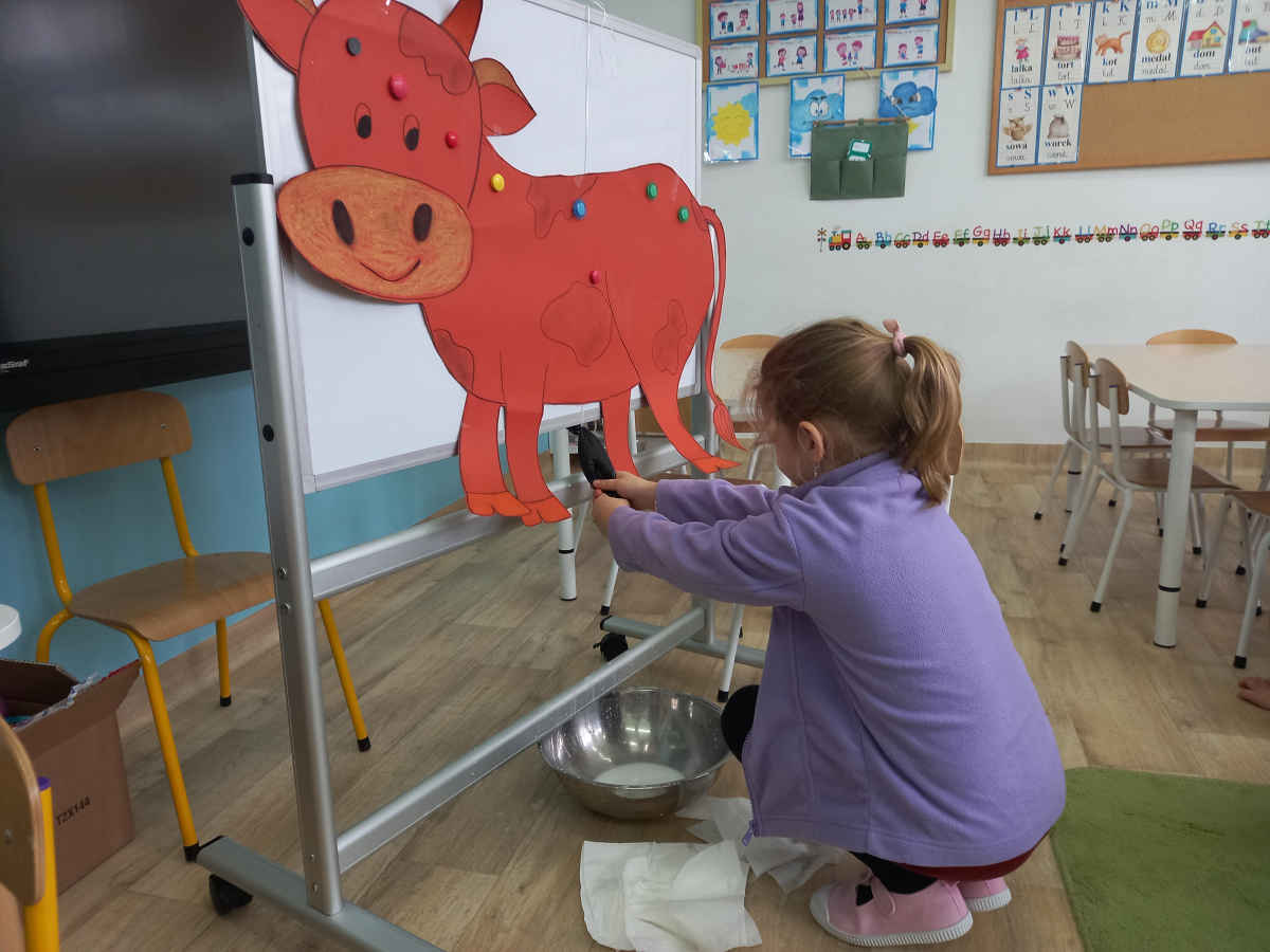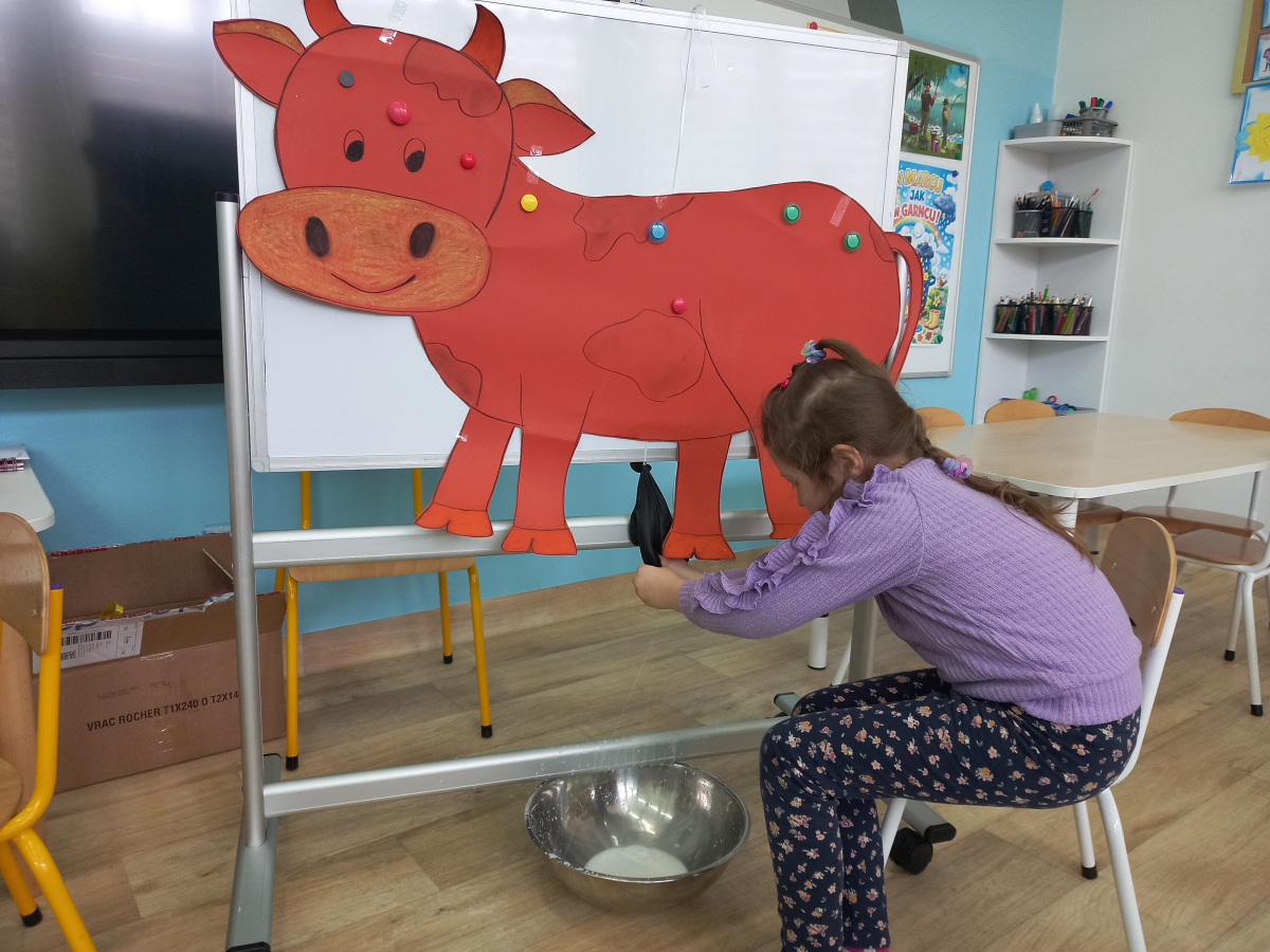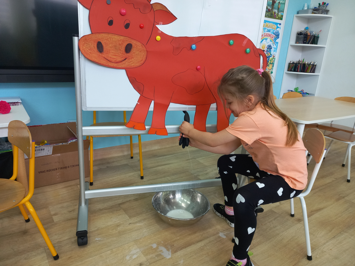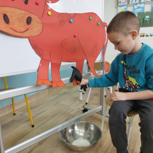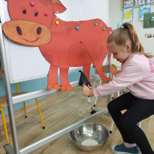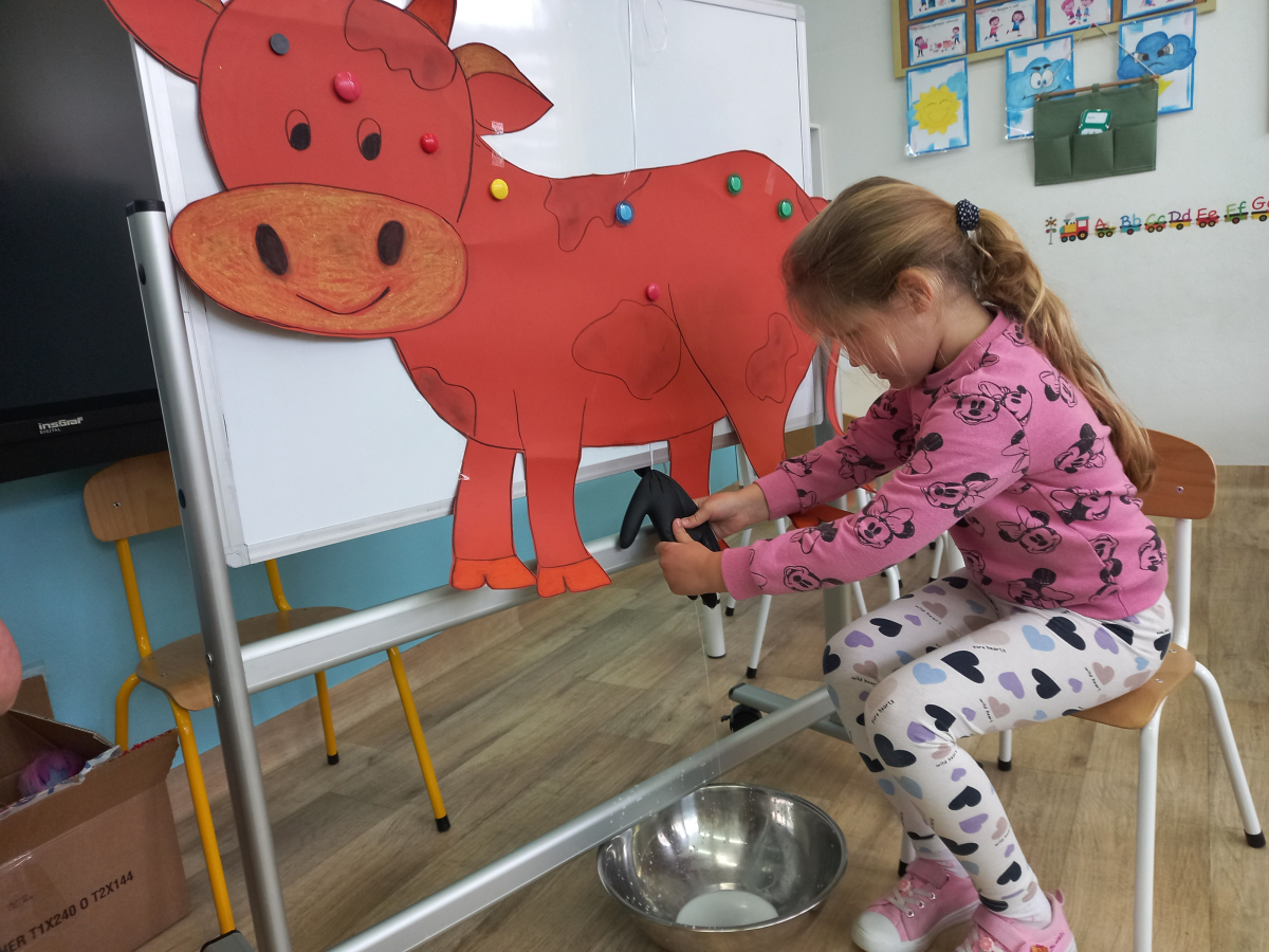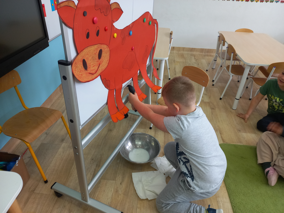 Dzieci podczas zajęć o gospodarstwie miały okazję spróbować dojenia krowy ;)