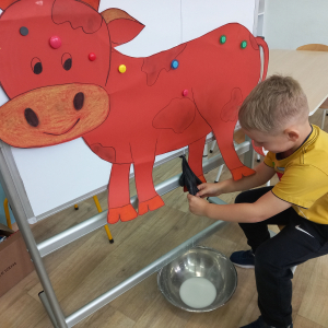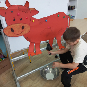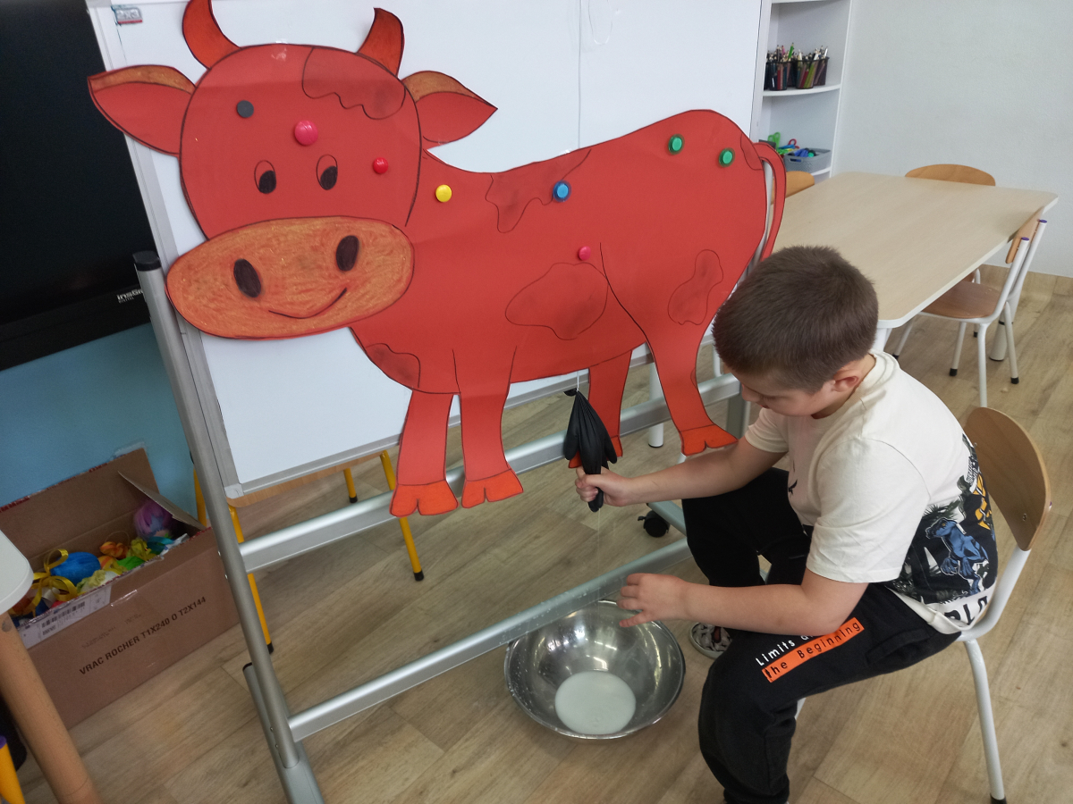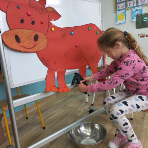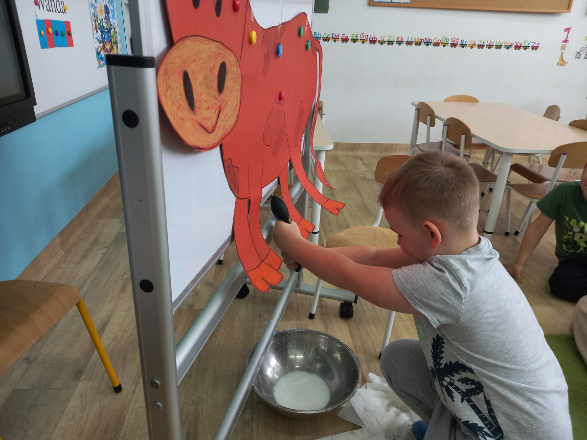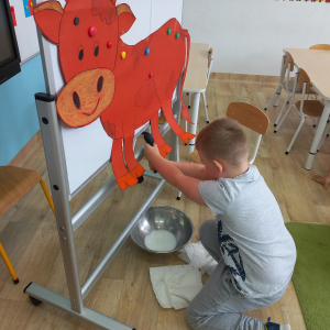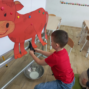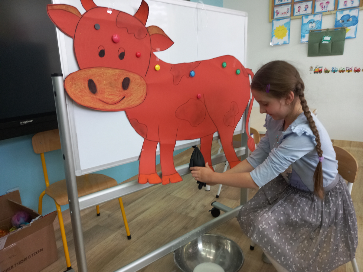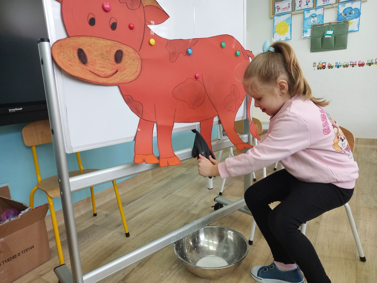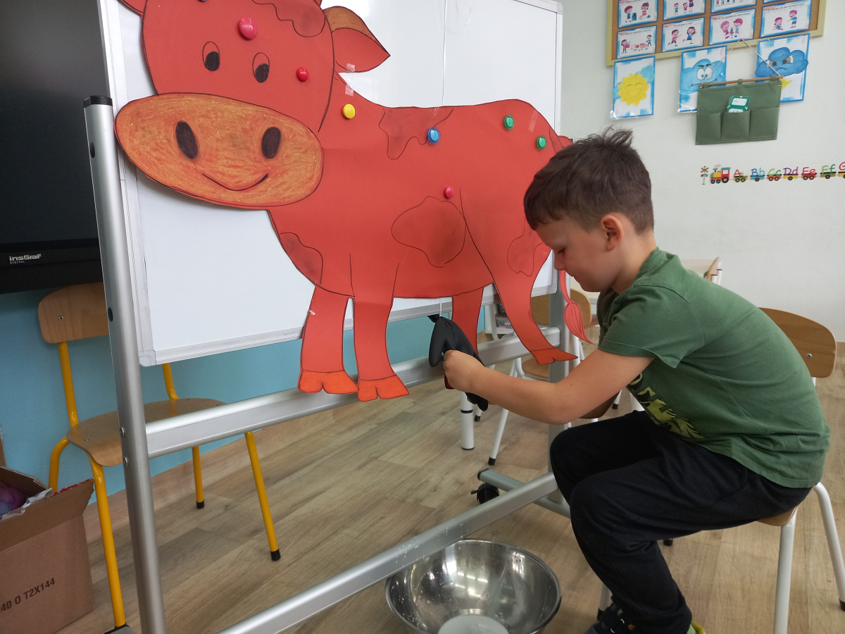 Dzieci podczas zajęć o gospodarstwie miały okazję spróbować dojenia krowy ;)