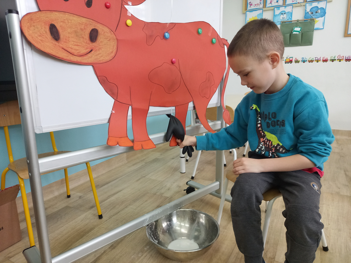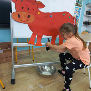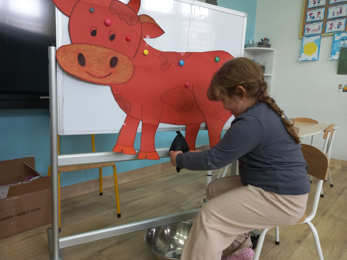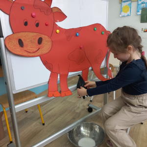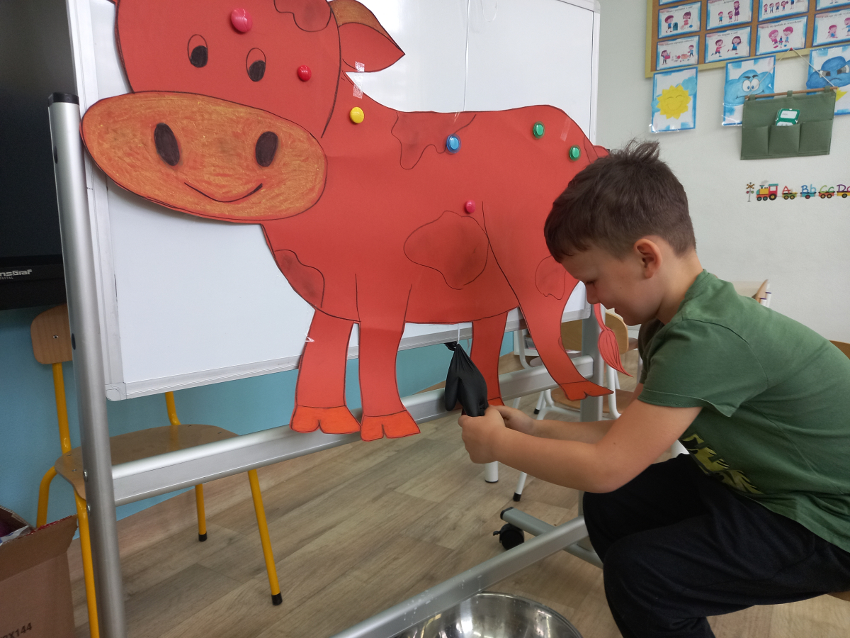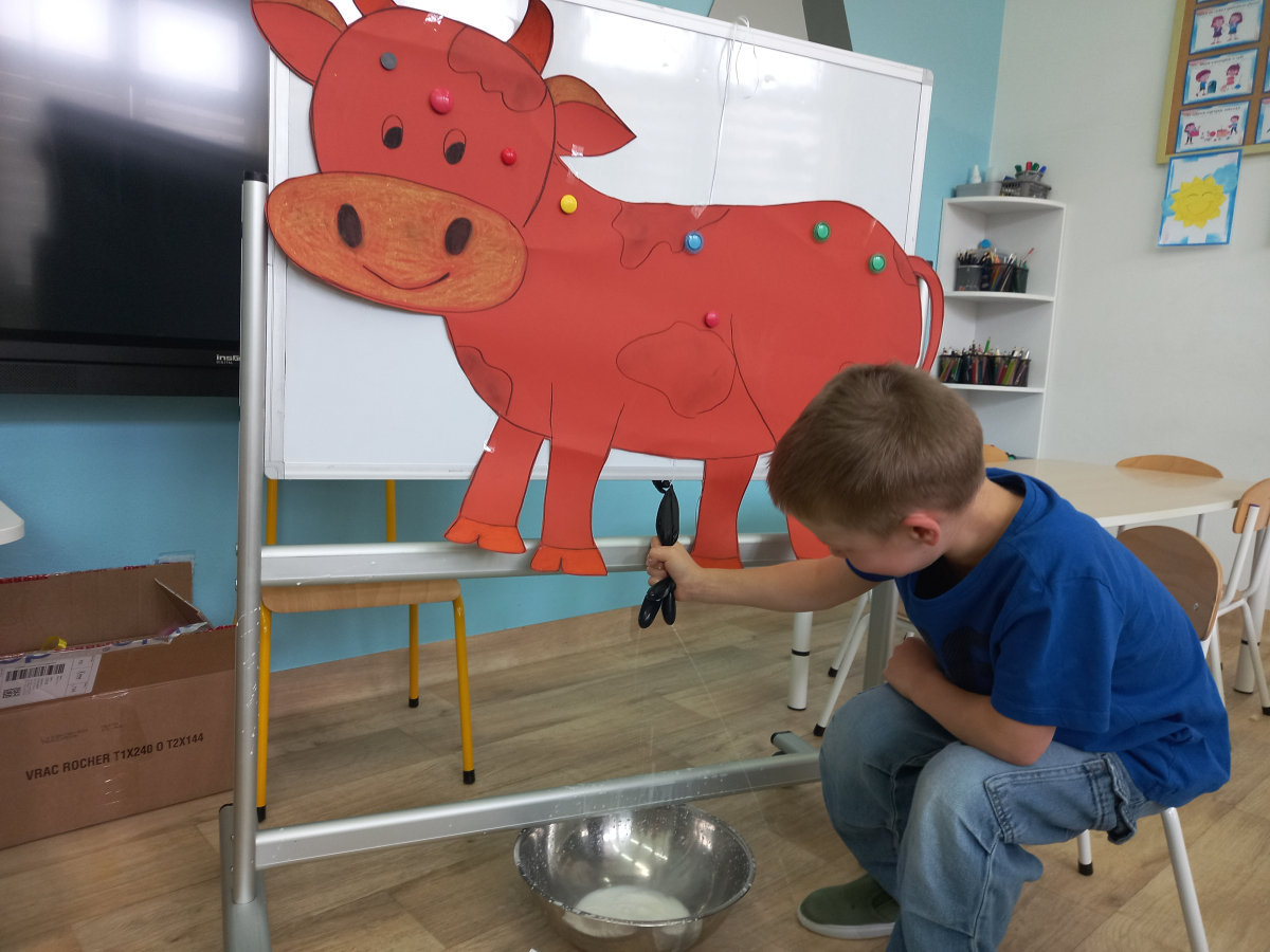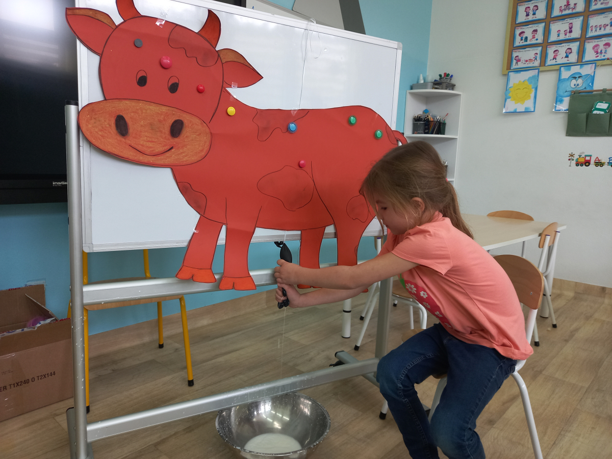 Dzieci podczas zajęć o gospodarstwie miały okazję spróbować dojenia krowy ;)