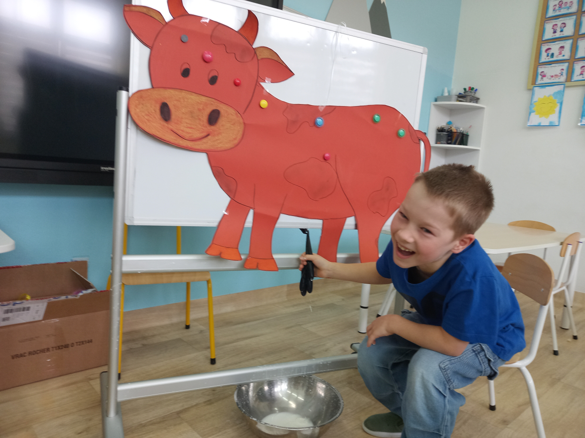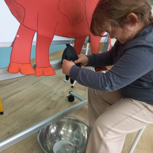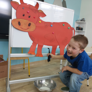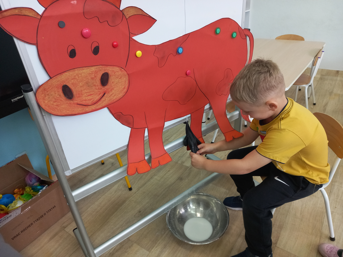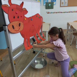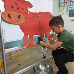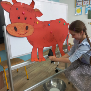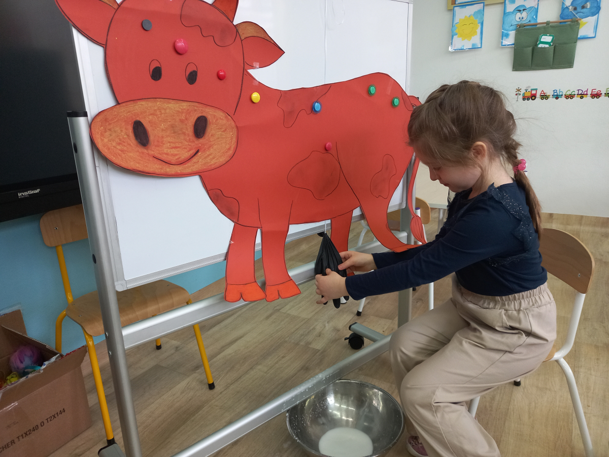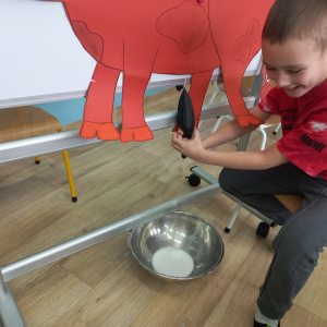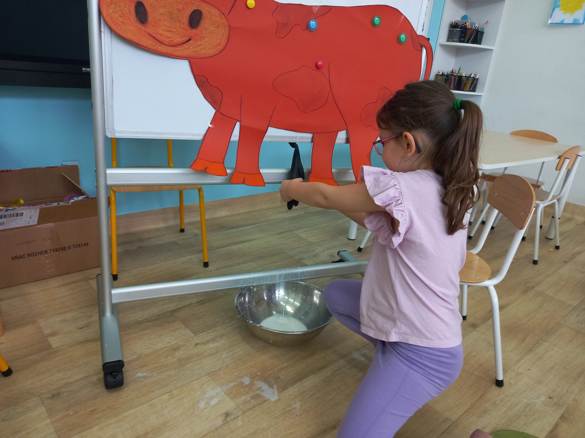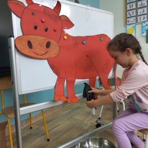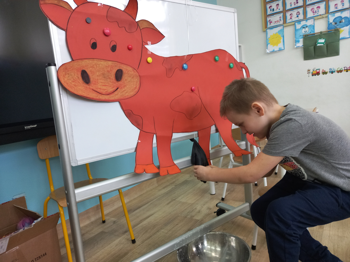 Dzieci podczas zajęć o gospodarstwie miały okazję spróbować dojenia krowy ;)