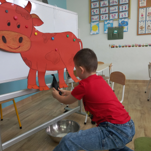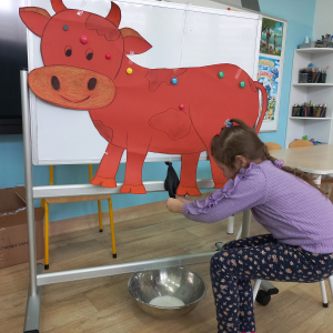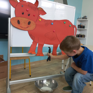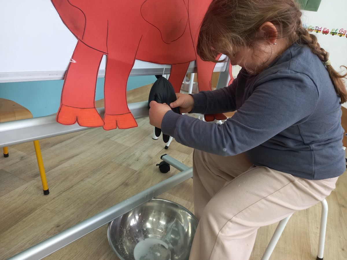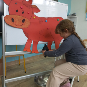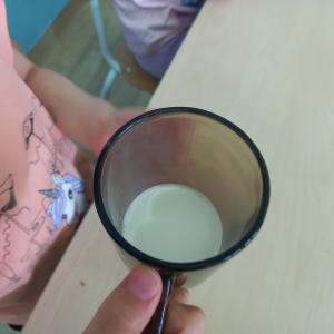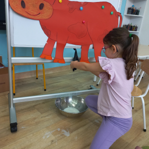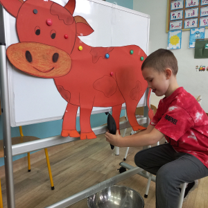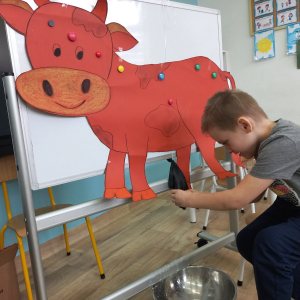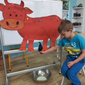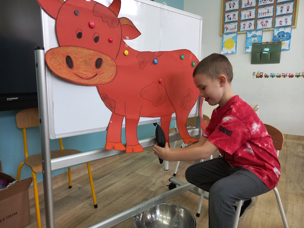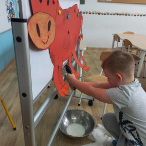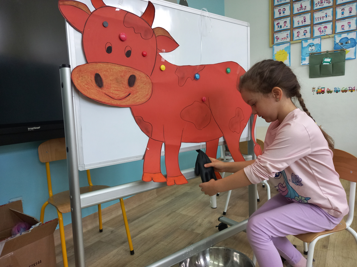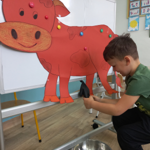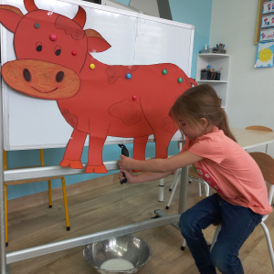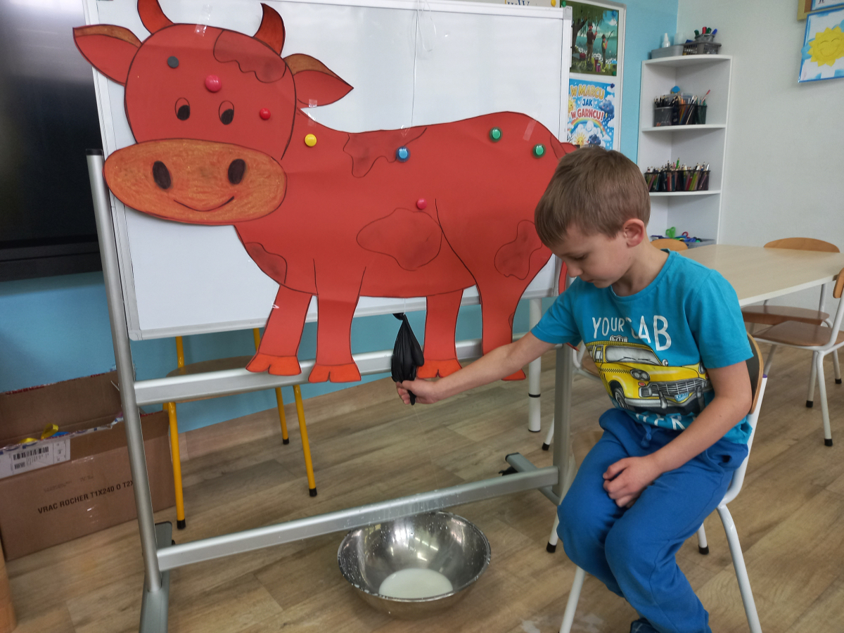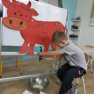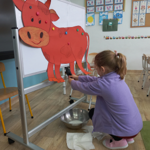 Dzieci podczas zajęć o gospodarstwie miały okazję spróbować dojenia krowy ;)